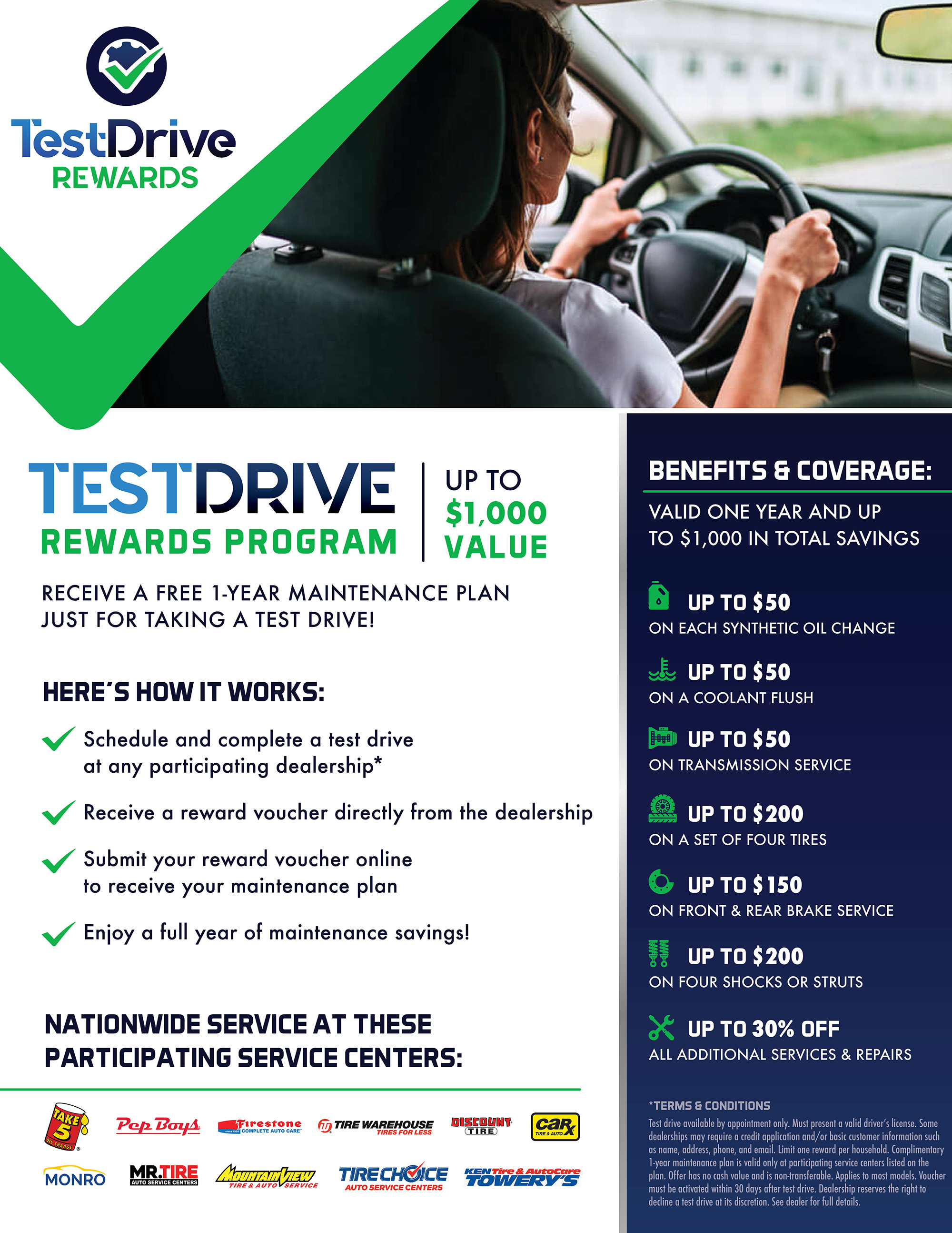 Take a test drive at our dealership and receive a FREE 1-year maintenance plan valued at up to $1,000, redeemable at trusted service centers nationwide like Pep Boys, Firestone, Monro, and more. This exclusive offer includes major savings on synthetic oil changes, coolant flushes, transmission service, brakes, tires, shocks, and up to 30% off additional repairs—all at no cost to you. Simply schedule and complete your test drive, receive your reward voucher, activate it online, and enjoy a full year of maintenance savings while keeping your vehicle in top condition.